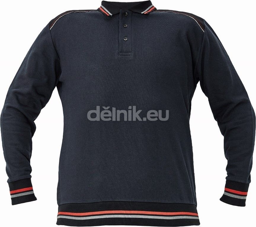 pánská mikina s límečkem, z počesaného výplňku směsi bavlny a polyesteru; sedlo v kontrastní černé barvě lemované reflexní paspulkou; propínací léga na 3 knoflíky; kontrastní proužky v límci; nápletech na rukávech a spodním lemu; dekorativní prošití v hi-vis barvě; svrchní materiál: 60 % bavlna, 40 % polyester, 300 g/m²
