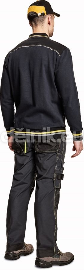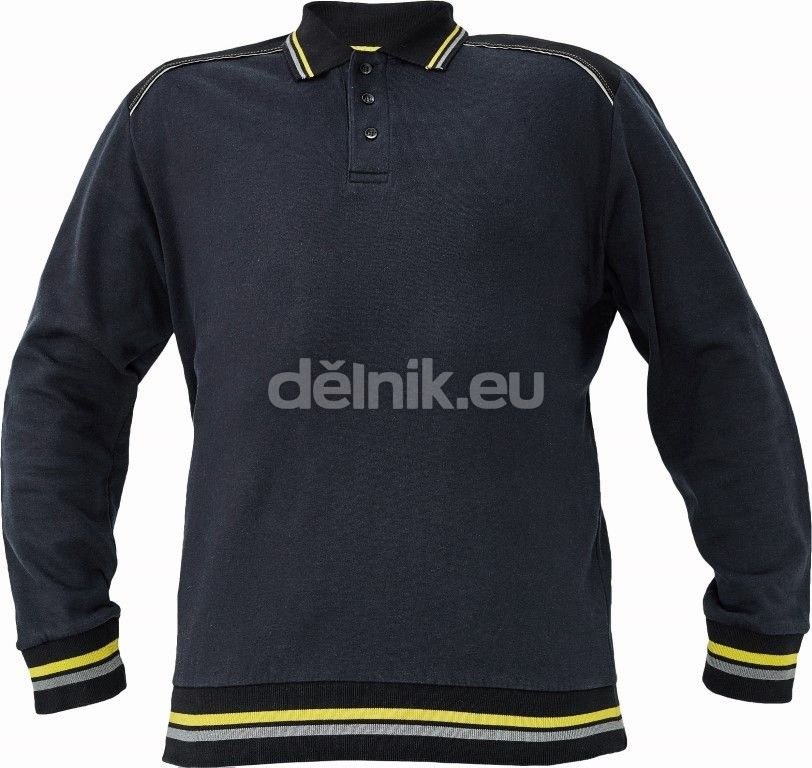 pánská mikina s límečkem, z počesaného výplňku směsi bavlny a polyesteru; sedlo v kontrastní černé barvě lemované reflexní paspulkou; propínací léga na 3 knoflíky; kontrastní proužky v límci; nápletech na rukávech a spodním lemu; dekorativní prošití v hi-vis barvě; svrchní materiál: 60 % bavlna, 40 % polyester, 300 g/m²