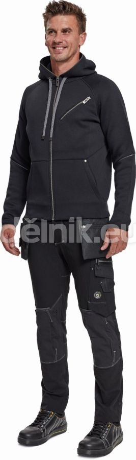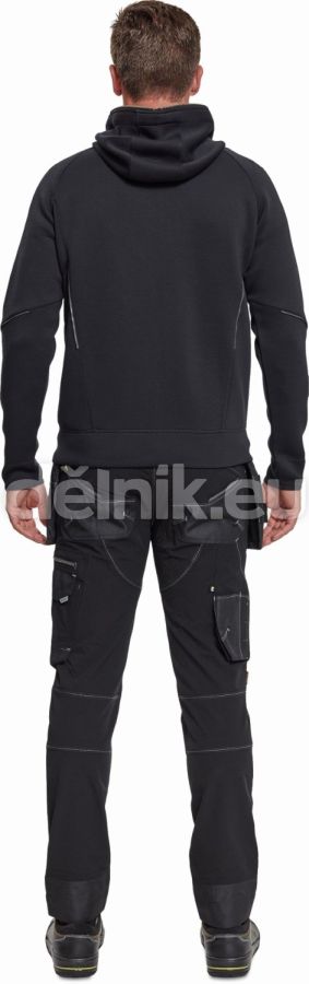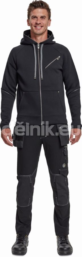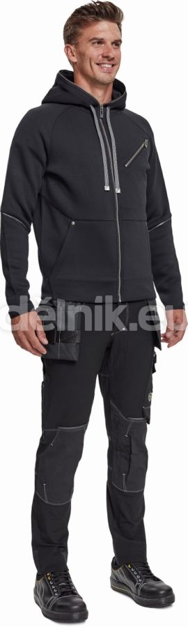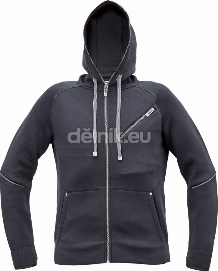 Celopropínací pánská mikina s kapucí; zapínání na zip je prodlouženo až po špičku kapuce; obvod kapuce lze upravit pomocí vložené tkanice; 2 postranní kapsy, 1 náprsní kapsa na zip; reflexní detaily. Složení: 80 % polyester, 14 % viskóza, 6 % elastan, 300 g/m²