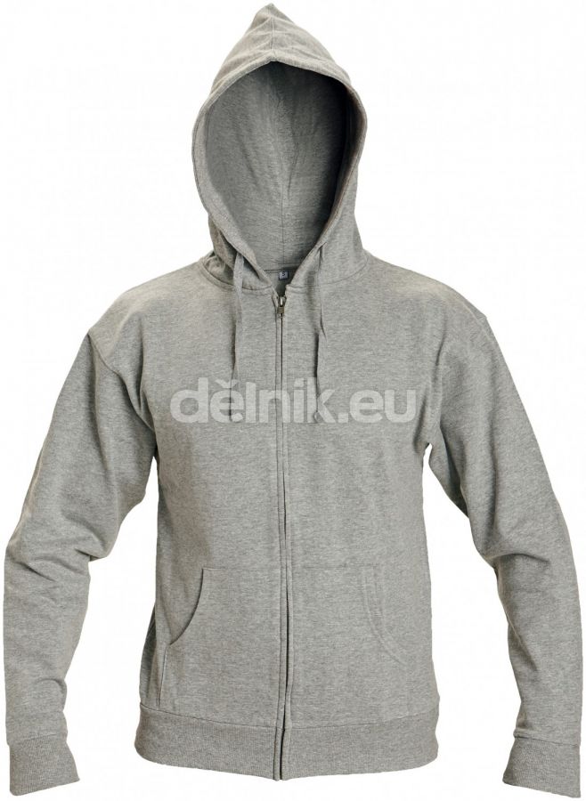 mikina s kapucí • zatahovatelná kapuce na kulaté tkanice • celopropínací s kovovým zipem • vnitřní strana počesaná • spodní lem a manžety rukávů z žebrového úpletu s příměsím elastanu • 80% bavlna 20% polyester • 290 g/m2