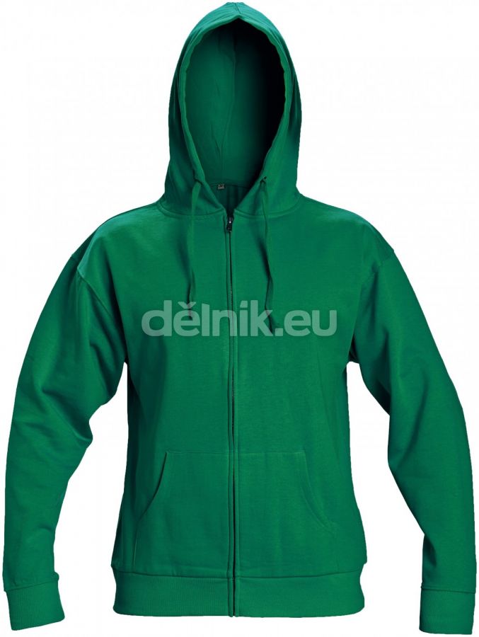 mikina s kapucí • zatahovatelná kapuce na kulaté tkanice • celopropínací s kovovým zipem • vnitřní strana počesaná • spodní lem a manžety rukávů z žebrového úpletu s příměsím elastanu • 80% bavlna 20% polyester • 290 g/m2