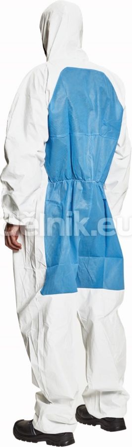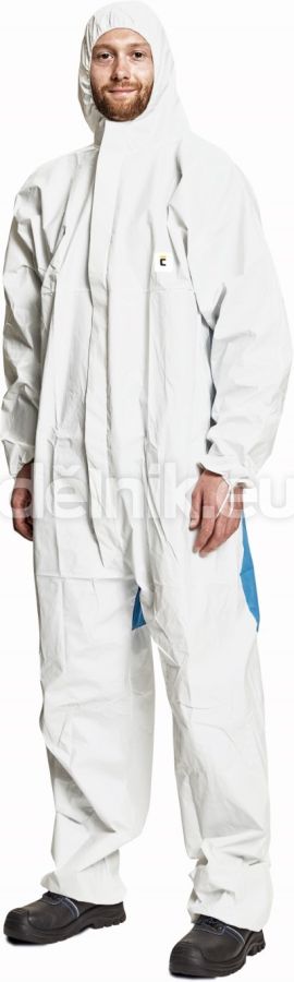 ochranná antistatická kombinéza s kapucí slouží i pro ochranu proti nebezpečným mirkoorganizmům; přední materiál je vyroben s mikroporézní paropropustné vrstvy; zadní panely v modré barvě jsou z prodyšného polypropylenu, materiálu SMMS, zlepšující komfort při práci; na konci manžet jsou umístěny poutka na palce, aby rukávy vždy perfektně seděly na rukou; elastické okraje rukávů i nohavic; v ochraně proti postřiku kapalnými chemikáliemi patří do kategorie CE III; v ochraně proti průniku pevných částic a ochraně proti aerosolům typu 5; v ochraně proti postřiku kapalnými chemikáliemi typu; v ochraně proti kontaminaci radioaktivními částicemi do kategorie Class 1; svrchní materiál: 100 % polypropylen