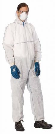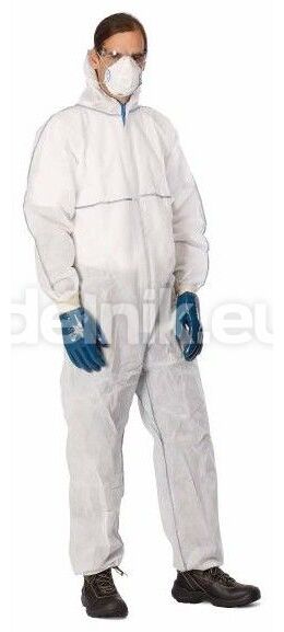 Ochranná kombinéza s kapucí, klopou na zipu a gumičkou stahovatelnými rukávy a nohavicemi, je odolná některým chemikáliím, patří do kategorie CE III, typu 5 a 6.