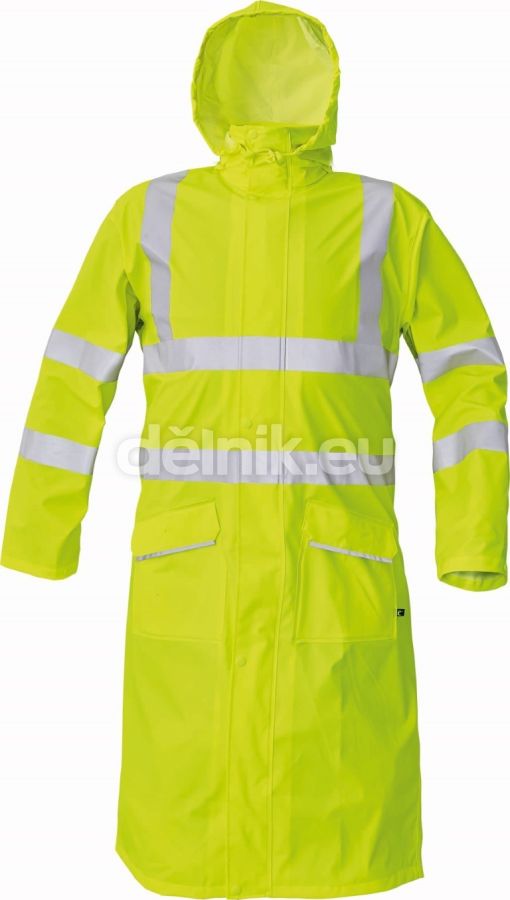 nepromokavý a větruodolný prodloužený plášť s kapucí v límci, délka 120 cm; reflexní pruhy po obvodu pasu, boků, rukávů a přes ramena; obvod kapuce lze stáhnout na tkaničku; dvě přední kapsy kryté légami s reflexní paspulí pro zvýšení viditelnosti; spodní lem rukávů lze polohovat drukem; HI-VIS provedení pouze ve žluté a oranžové barvě; svrchní materiál: 100 % polyester, 200 g/m²; povrstvení: polyuretan, tloušťka 0,5 mm