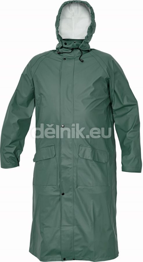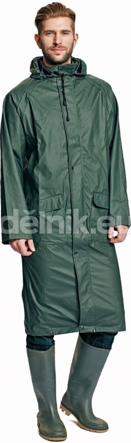 nepromokavý a větruodolný prodloužený plášť s kapucí v límci, délka 120 cm; obvod kapuce lze stáhnout na tkaničku; dvě přední kapsy kryté légami; spodní lem rukávů lze polohovat drukem; svrchní materiál: 100 % polyester, 200 g/m²; povrstvení: polyuretan, tloušťka 0,5 mm