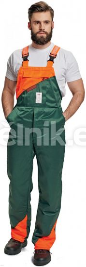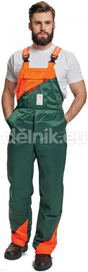 PLUTO pracovní ochranné protipořez.kalhoty lacl zelená - Protipořezové kalhoty s laclem pohodlného střihu v zeleném provedení s výstražným oranžovým značením. V dolní části jsou opatřeny protiklíšťatovou úpravou. Velikosti 46-68