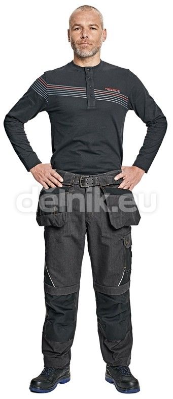 • pánské pracovní kalhoty do pasu, s odnímatelnými multifunkčními kapsami na předním díle • prostorné kapsy na možnost vkládání odnímatelných kapes • široká pasová poutka • postranní kapsa s poutkem na nářadí • velké nakládané kapsy s klopou na suchý zip na zadním díle • nákolenní kapsy ze zesíleného materiálu Oxford s možností vložení kolenních výztuh • zpevnění švů trojitým prošitím • znásobené prošití v namáhaných místech v kontrastní barvě • upravitelná délka nohavic • dekorativní paspule z reflektivního materiálu