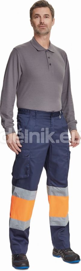 pánské lehké pracovní kalhoty v kombinaci s HI-VIS holenní částí s reflexními pruhy, elastický pas; 2 postranní kapsy, 1 kapsička na mince; 2 stehenní kapsy, 2 zadní kapsy; nastavitelná délka nohavic; svrchní materiál: 65 % polyester, 35 % bavlna, 195 g/m²; svrchní zesílená vrstva: 50 % polyester, 50 % bavlna, 200 g/m²