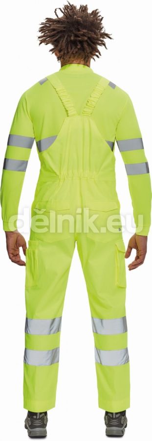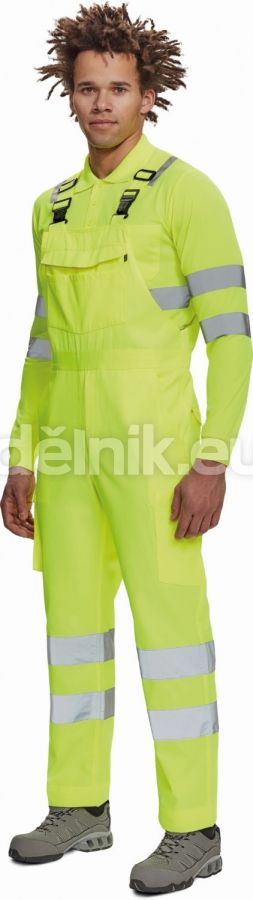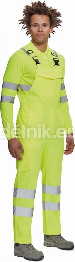 pánské lehké full HI-VIS pracovní kalhoty s laclem a reflexními pruhy na nohavicích, elastický pas; 2 boční kapsy, 1 kapsička na mince; 2 multifunkční stehenní kapsy, 2 zadní kapsy; 1 velká multifunkční náprsní kapsa; elastické šle se zapínáním na spon; nastavitelná délka nohavic; svrchní materiál: 50 % bavlna, 50 % polyester, 200 g/m²