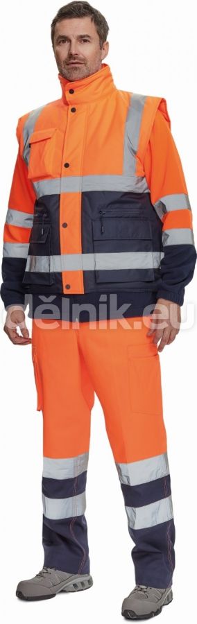 pánská zateplená HI-VIS vesta s reflexními pruhy přes ramena a v bocích; kapuce skrytá v límci; zapínání na zip kryté légou se zapínáním na druky; 2 přední multifunkční kapsy s klopou a zapínáním na zip; 1 náprsní kapsa s klopou; svrchní materiál: 100 % polyester, 280 g/m²