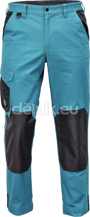 ;pánské pracovní kalhoty; materiál s vysokým procentem bavlněného podílu; moderní střih; zesílená oblast kolen materiálem Oxford s možností vkládání kolenních výztuh; 2 boční kapsy; 1 multifunkční kapsa na nohavici; 1 zadní kapsa se zapínáním na suchý zip; elastický pas; "D" kroužek; kontrastní paspulky; nastavitelná délka nohavic; svrchní materiál: 60 % bavlna, 40 % polyester, 230 g/m²; vrchní zesílená vrstva: 100 % polyester