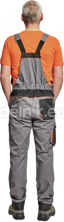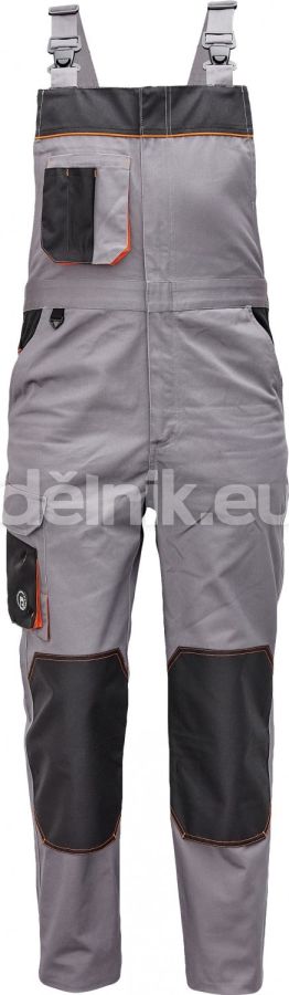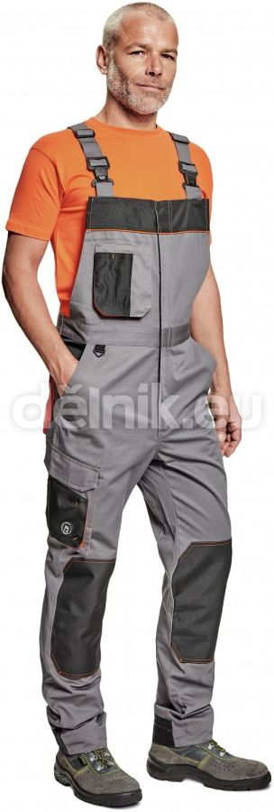 pánské pracovní kalhoty s laclem; materiál s vysokým procentem bavlněného podílu; moderní střih; zesílená oblast kolen materiálem Oxford s možností vkládání kolenních výztuh; 2 boční kapsy; 1 multifunkční kapsa na nohavici; 1 zadní kapsa se zapínáním na suchý zip; 1 náprsní multifunkční kapsa; elastický pas; "D" kroužek; dvoucestný zip; kontrastní paspulky; nastavitelná délka; svrchní materiál: 60 % bavlna, 40 % polyester, 230 g/m²; svrchní zesílená vrstva: 100 % polyester