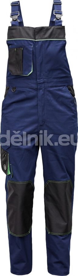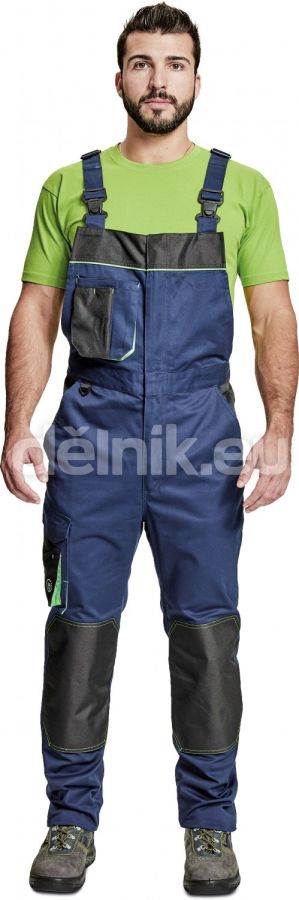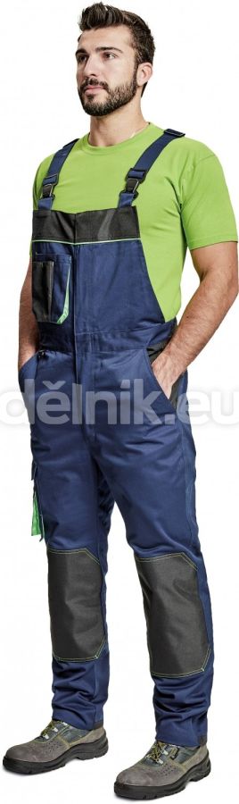 pánské pracovní kalhoty s laclem; materiál s vysokým procentem bavlněného podílu; moderní střih; zesílená oblast kolen materiálem Oxford s možností vkládání kolenních výztuh; 2 boční kapsy; 1 multifunkční kapsa na nohavici; 1 zadní kapsa se zapínáním na suchý zip; 1 náprsní multifunkční kapsa; elastický pas; "D" kroužek; dvoucestný zip; kontrastní paspulky; nastavitelná délka; svrchní materiál: 60 % bavlna, 40 % polyester, 230 g/m²; svrchní zesílená vrstva: 100 % polyester