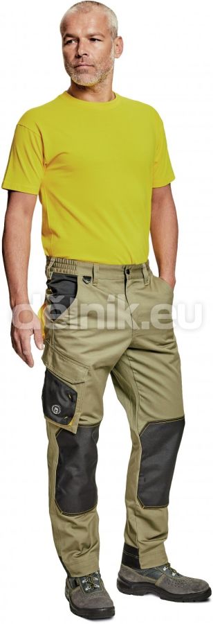 ;pánské pracovní kalhoty; materiál s vysokým procentem bavlněného podílu; moderní střih; zesílená oblast kolen materiálem Oxford s možností vkládání kolenních výztuh; 2 boční kapsy; 1 multifunkční kapsa na nohavici; 1 zadní kapsa se zapínáním na suchý zip; elastický pas; "D" kroužek; kontrastní paspulky; nastavitelná délka nohavic; svrchní materiál: 60 % bavlna, 40 % polyester, 230 g/m²; vrchní zesílená vrstva: 100 % polyester