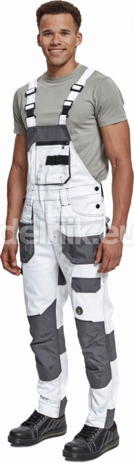 pánské pracovní kalhoty s laclem; elastický inovativní materiál TRIFIBETEX; ergonomický střih; pružný pas; odolné trojité prošití nohavic a sedu; zesílená oblast kolen s možností vkládání kolenních výztuh; prostorné multifunkční přední kapsy s poutky na nářadí; 2 zadní kapsy s klopou zesílené Oxfordem; stehenní kapsa na telefon s klopou a zapínáním na suchý zip; kapsa na metr a nůž; poutko na kladivo; "D" kroužek; poutko na nářadí v pase; reflektivní prvky v barevném odstínu; nastavitelná délka nohavic; svrchní materiál: 62 % bavlna, 35 % polyester, 3 % elastan, 260 g/m², TRIFIBETEX; svrchní zesílená vrstva: 100 % polyester