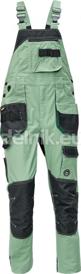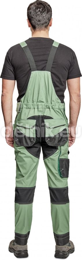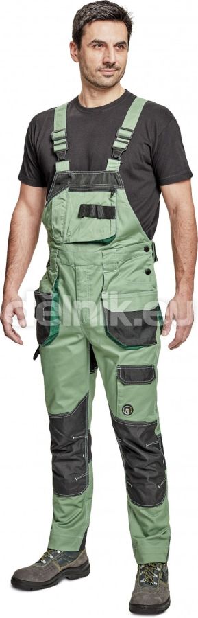 pánské pracovní kalhoty s laclem; elastický inovativní materiál TRIFIBETEX; ergonomický střih; pružný pas; odolné trojité prošití nohavic a sedu; zesílená oblast kolen s možností vkládání kolenních výztuh; prostorné multifunkční přední kapsy s poutky na nářadí; 2 zadní kapsy s klopou zesílené Oxfordem; stehenní kapsa na telefon s klopou a zapínáním na suchý zip; kapsa na metr a nůž; poutko na kladivo; "D" kroužek; poutko na nářadí v pase; reflektivní prvky v barevném odstínu; nastavitelná délka nohavic; svrchní materiál: 62 % bavlna, 35 % polyester, 3 % elastan, 260 g/m², TRIFIBETEX; svrchní zesílená vrstva: 100 % polyester