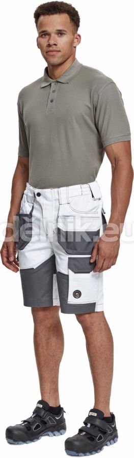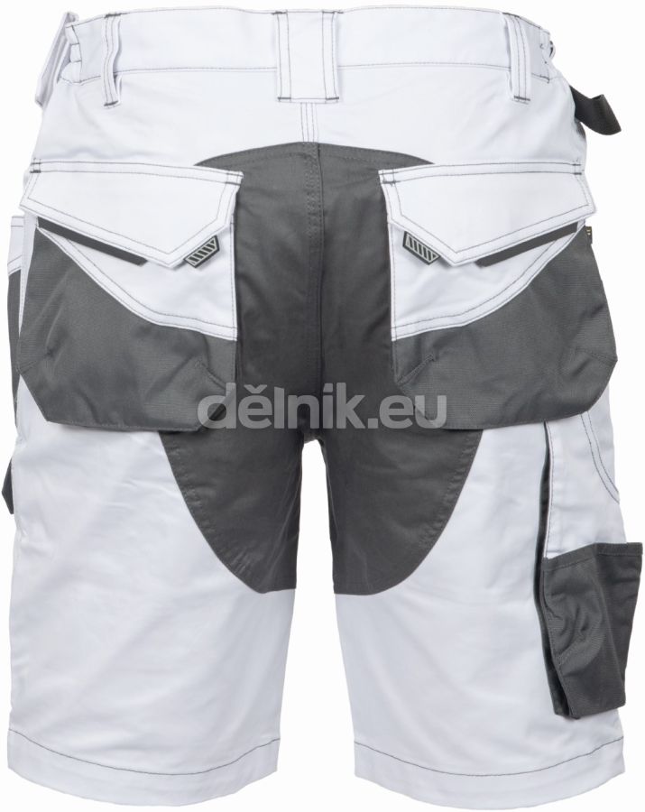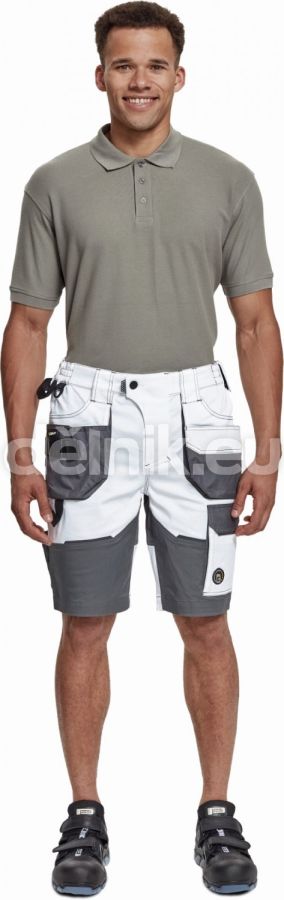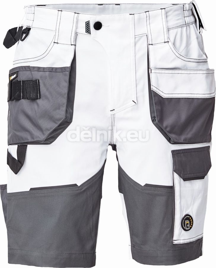 pánské pracovní šortky; elastický inovativní materiál TRIFIBETEX; ergonomický střih; snížený pružný pas; odolné trojité prošití nohavic a sedu; prostorné multifunkční přední kapsy s poutky na nářadí; 2 zadní kapsy s klopou zesílené Oxfordem; stehenní kapsa na telefon s klopou a zapínáním na suchý zip; kapsa na metr a nůž; poutko na kladivo; "D" kroužek; poutko na nářadí v pase; originální zpracování zapínání kalhot; reflektivní prvky v barevném odstínu; svrchní materiál: 62 % bavlna, 35 % polyester, 3 % elastan, 260 g/m², TRIFIBETEX; svrchní zesílená vrstva: 100 % polyester