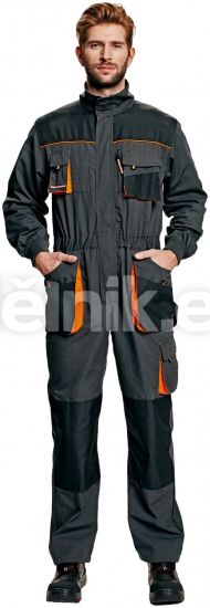 EMERTON pracovní kombinéza - Montérkový overal zhotovený z velmi kvalitní tkaniny, 65% polyester / 35% bavlna, 280 g/m2, vyztužení materiálem 600D polyester, kombinace černá / oranžová, velikosti 48-64