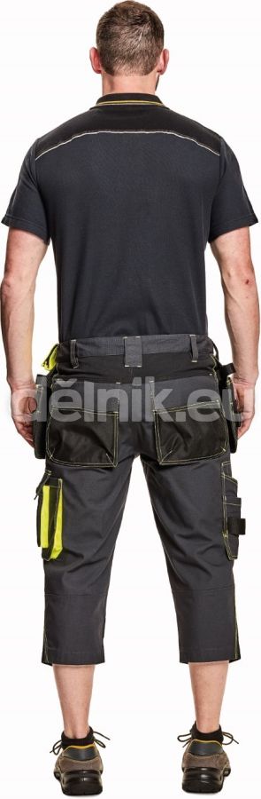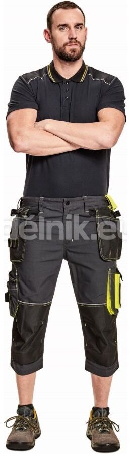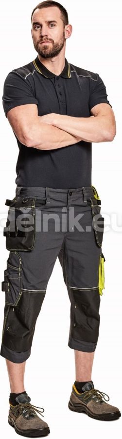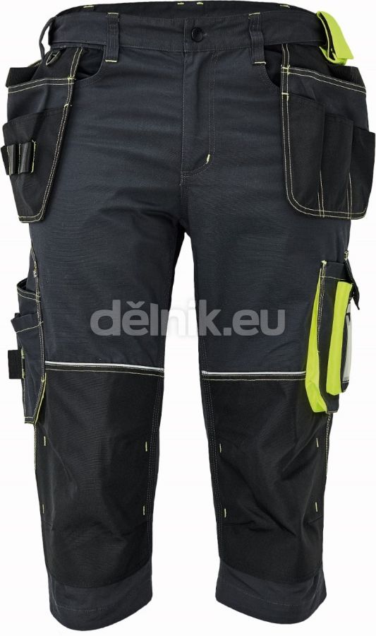 pánské pracovní 3/4 kalhoty s elastickým pasem; 2 postranní kapsy a 2 vložitelné multifunkční kapsy na nářadí; 2 boční kapsy na nohavicích + 1 transparentní pro ID kartu, D kroužek; 2 nakládané zadní kapsy s patkou; poutko na nářadí v kontrastní barvě; 2 postranní poutka na nářadí; zesílená oblast kolen s možností vkládání kolenních výztuh; dekorativní prošití a kontrastní prvky v hi-vis barvě; svrchní materiál: 65 % polyester, 35 % bavlna, 320 g/m²; svrchní zesílená vrstva: polyester