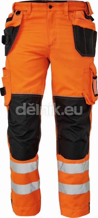 pánské pracovní kalhoty v hi-vis provedení s elastickým pasem; 2 postranní kapsy a 2 vložitelné multifunkční kapsy na nářadí; 2 boční kapsy na nohavicích + 1 transparentní pro ID kartu, D kroužek; 2 nakládané zadní kapsy s patkou; poutko na nářadí v kontrastní barvě; 2 postranní poutka na nářadí; zesílená oblast kolen s možností vkládání kolenních výztuh; záložka na nohavici umožňující prodloužení délky až o 5 cm; zesílená zadní strana spodku nohavice; dekorativní prošití; svrchní materiál: 80 % polyester, 20 % bavlna, 310 g/m²; svrchní zesílená vrstva: 100 % polyester