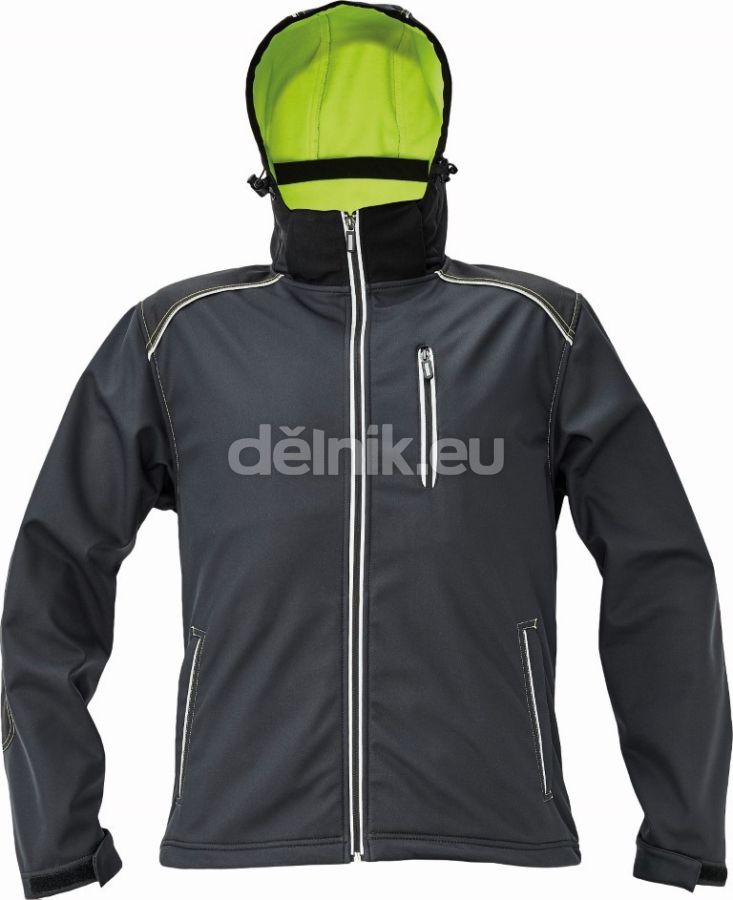 pánská sofsthellová bunda s odnímatelnou kapucí, s PU membránou zajišťující voděodolnost a paropropustnost; zesílená oblast ramen a loktů; 1 náprsní kapsa na zip; 2 postranní lištové kapsy; 2 uzavíratelné vnitřní kapsy; reflexní paspulka lemující sedlo a boční kapsy; nastavitelná šíře spodního obvodu a rukávů; svrchní materiál: 100 % polyester, 290 g/m²; povrstvení: polyuretan
