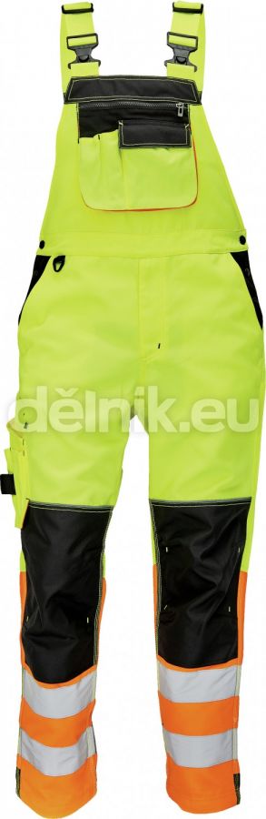 • pánské pracovní kalhoty s laclem v hi-vis provedení • elastické šle a pas • 2 hluboké postranní kapsy • 1 multifunkční kapsa na straně nohavice • 1 nakládaná multifunkční náprsní kapsa na laclu • D koužek pro přichycení identifikační karty • 2 nakládané zadní kapsy s patkou • zesílená oblast kolen s možností vkládání kolenních výztuh • záložka na nohavici umožňující prodloužení délky až o 5 cm • zesílená zadní strana spodku nohavice • dekorativní prošití