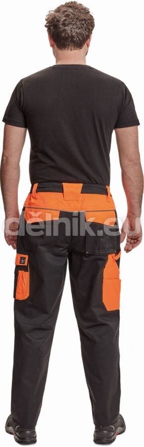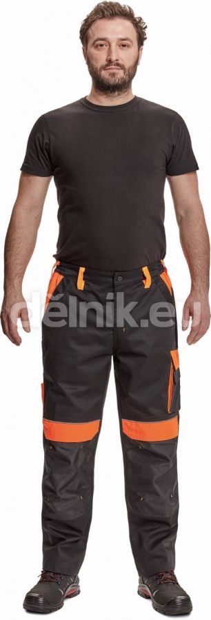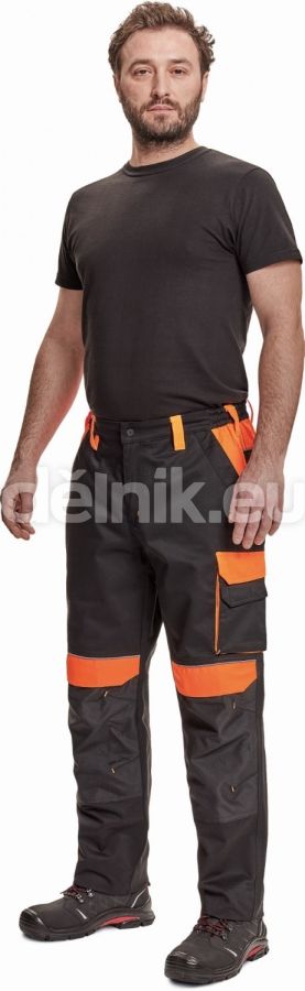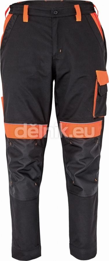 pánské pracovní kalhoty s elastickým pasem; 2 přední kapsy, 1 levá zdvojená stehenní kapsa; 2 zadní kapsy, 2 menší zadní kapsičky na pravém stehnu; reflexní paspulky; Oxford 600D zesílení kolen s možností horního vkládání nákoleníků; možnost prodloužení nohavic; materiál: 65 % polyester, 35 % bavlna, 250 g/m²
