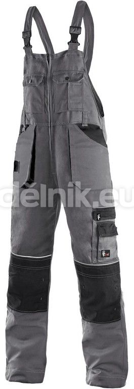 Pánské s náprsenkou, zdvojená kolena pro nákoleníky, našité kapsy, klínové přední kapsy s poutky na nářadí, náprsenka s kapsami a rozepínáním uprostřed, reflexní doplňky, materiál: kepr 60% bavlna 40% polyester 280g/m2. Velikost: 46 - 64. Normy: EN340.