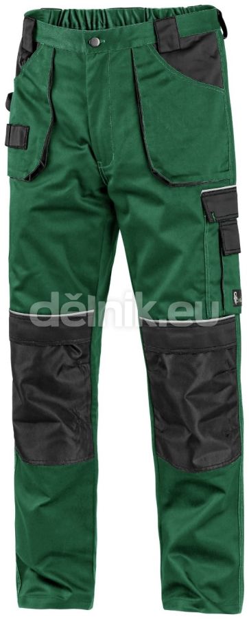 Pánské montérkové kalhoty, pas s poutky na opasek, vzadu do gumy, přední kapsy s poutky na nářadí, multifunkční kapsy na obou stranách, kolena zesílena 600D polyesterem s možností vložení kolenních výztuh, dvě zadní kapsy, jedna na suchý zip, reflexní doplňky. Doporučené použití: stavebnictví, strojírenství, lehký průmysl, automobilový průmysl, logistika, skladová manipulace, spedice, autoservisy, údržba, montáže, zemědělství, zahrada, hobby. Složení: 60 % bavlna, 40 % polyester, 280 g/m2