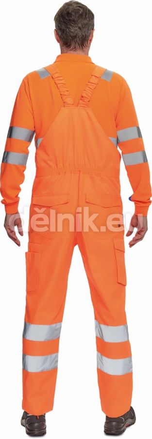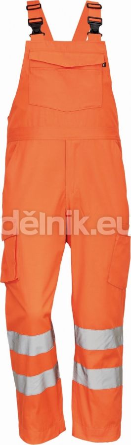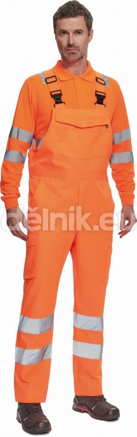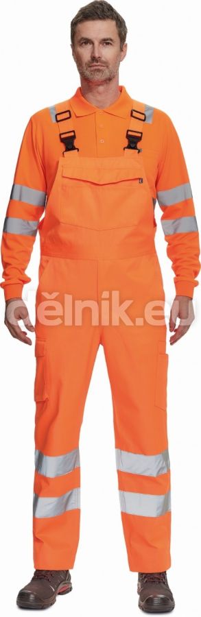 pánské lehké full HI-VIS pracovní kalhoty s laclem a reflexními pruhy na nohavicích, elastický pas; 2 boční kapsy, 1 kapsička na mince; 2 multifunkční stehenní kapsy, 2 zadní kapsy; 1 velká multifunkční náprsní kapsa; elastické šle se zapínáním na spon; nastavitelná délka nohavic; svrchní materiál: 50 % bavlna, 50 % polyester, 200 g/m²