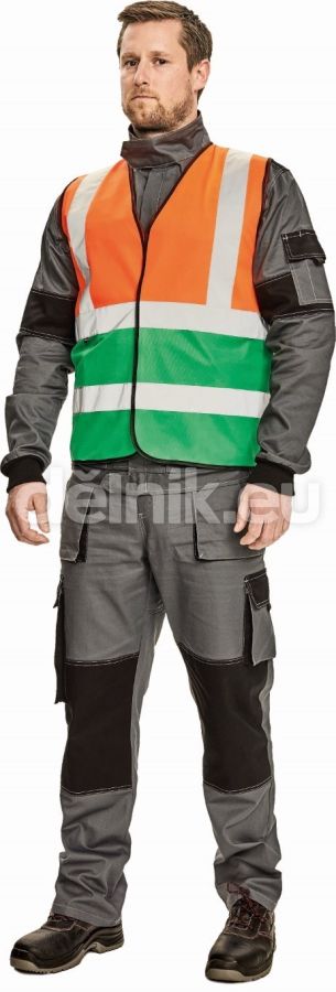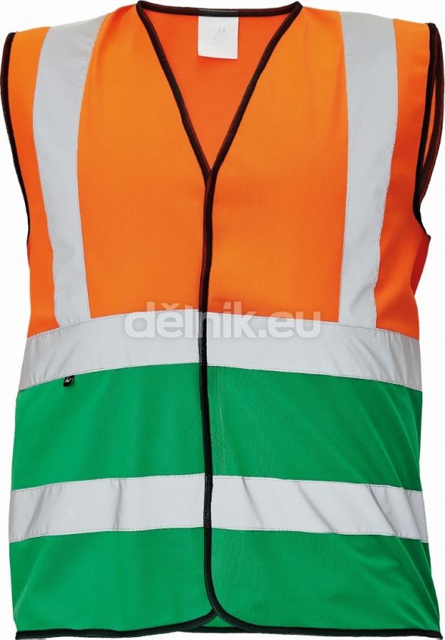 HI-VIS reflexní vesta s různobarevným provedením spodní části; reflexní pruhy přes ramena a okolo hrudi a pasu; zapínání na suchý zip; svrchní materiál: 100 % polyester