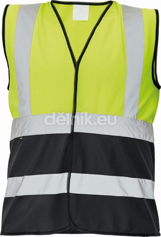HI-VIS reflexní vesta s různobarevným provedením spodní části; reflexní pruhy přes ramena a okolo hrudi a pasu; zapínání na suchý zip; svrchní materiál: 100 % polyester