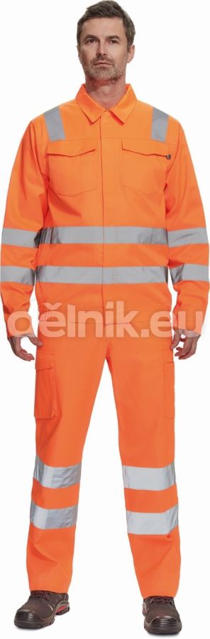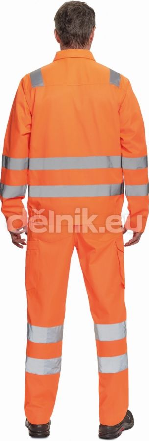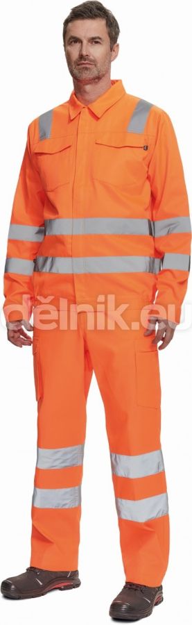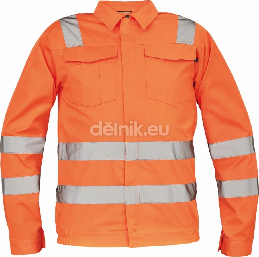 pánská lehká full HI-VIS pracovní bunda s reflexními pruhy přes ramena, v bocích a na rukávech; zapínání na zip kryté légou na suchý zip; 2 náprsní kapsy s klopou; nastavitelná šířka rukávů pomocí suchého zipu; elastický lem boků; svrchní materiál: 50 % bavlna, 50 % polyester, 200 g/m²