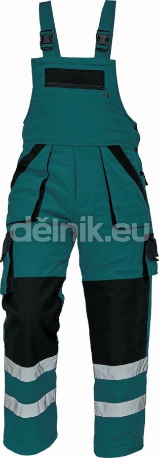 pánské zateplené pracovní kalhoty s laclem; široké šle s plastovými sponami; 2 přední kapsy, 2 stehenní kapsy; 1 velká náprsní kapsa na zip, 2 zadní kapsy; reflexní pruhy po odvodu spodních nohavic; zesílená oblast kolen; svrchní materiál: 100 % bavlna, 260 g/m²; vnitřní podšívka: 100 % polyester