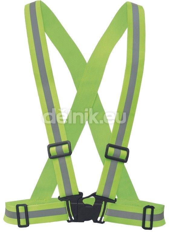 Materiál: Svrchní materiál: 100 % polyester Popis: elastický reflexní kříž; šířka popruhů 4 cm; šířka reflexního pásku 1,5 cm; nastavitelná délka přes ramena a obvod pasu (max. 160 cm); přední zapínání plastovou přezkou; EN 13356: 2001 – viditelné doplňky pro neprofesionální použití; zabaleno v plastovém sáčku s Euro otvorem na zavěšení. Normy: EN 13356 EN ISO 13688