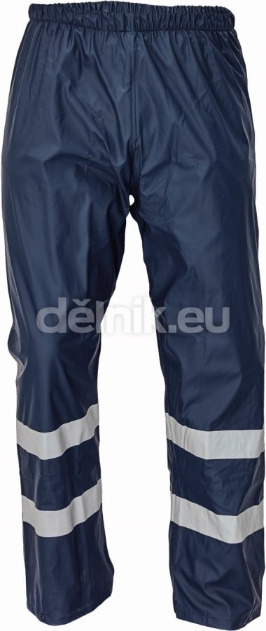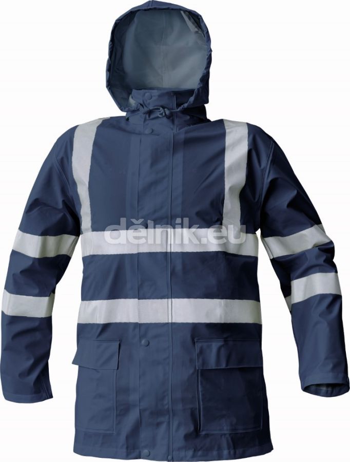 nepromokavý a větruodolný komplet bundy a kalhot; ¾ plášť s kapucí v límci; kalhoty s gumou v pase; reflexní pruhy bundy po obvodu pasu, boků, rukávů a přes ramena; reflexní pruhy kalhot po obvodu spodních nohavic; dvě přední kapsy bundy kryté légami; spodní lem rukávů lze polohovat drukem; HI-VIS provedení pouze ve žluté a oranžové barvě; svrchní materiál: 100 % polyester, 200 g/m²; povrstvení: polyuretan, tloušťka 0,5 mm