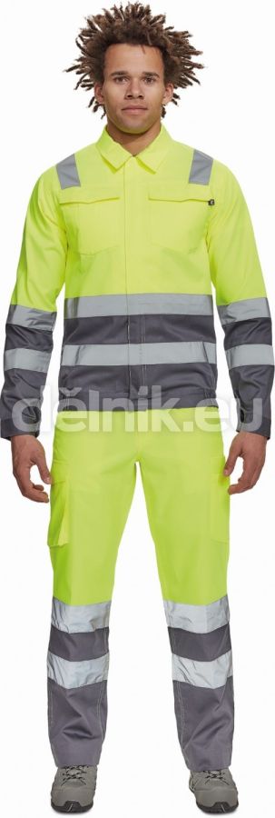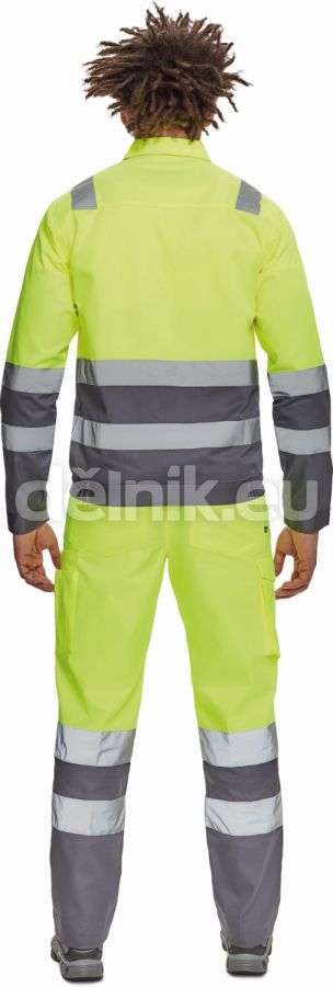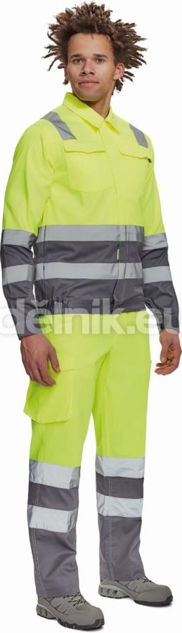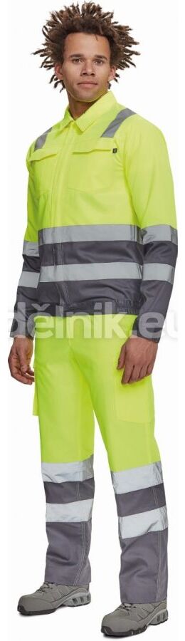 pánská lehká HI-VIS pracovní bunda s reflexními pruhy přes ramena, v bocích a na rukávech; zapínání na zip kryté légou na suchý zip; 2 náprsní kapsy s klopou; elastický lem v bocích; nastavitelná šířka rukávů pomocí suchého zipu; svrchní materiál: 65 % polyester, 35 % bavlna, 195 g/m²; svrchní zesílená vrstva: 50 % polyester, 50 % bavlna, 200 g/m²
