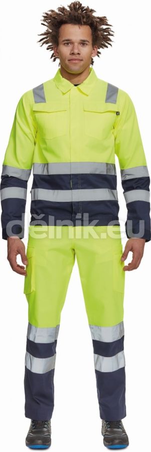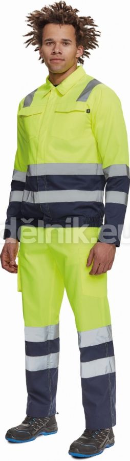 pánská lehká HI-VIS pracovní bunda s reflexními pruhy přes ramena, v bocích a na rukávech; zapínání na zip kryté légou na suchý zip; 2 náprsní kapsy s klopou; elastický lem v bocích; nastavitelná šířka rukávů pomocí suchého zipu; svrchní materiál: 65 % polyester, 35 % bavlna, 195 g/m²; svrchní zesílená vrstva: 50 % polyester, 50 % bavlna, 200 g/m²