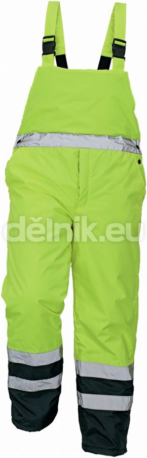 Zateplené voděodolné výstražné kalhoty s laclem a reflexními pruhy.