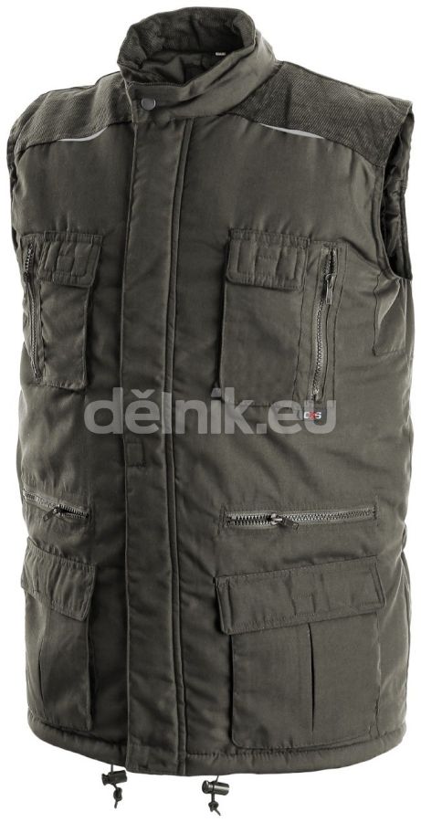 Zateplená vesta, ramena a límec pošitý manšestrem, pružné stažení průramku, možnost stažení vesty v pase, 14 kapes - z toho 3 kapsy uvnitř vesty. Složení: 65% polyester, 35% bavlna, výplň 100% polyester, podšívka 100% polyester