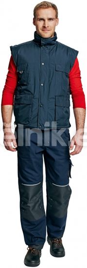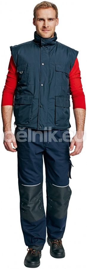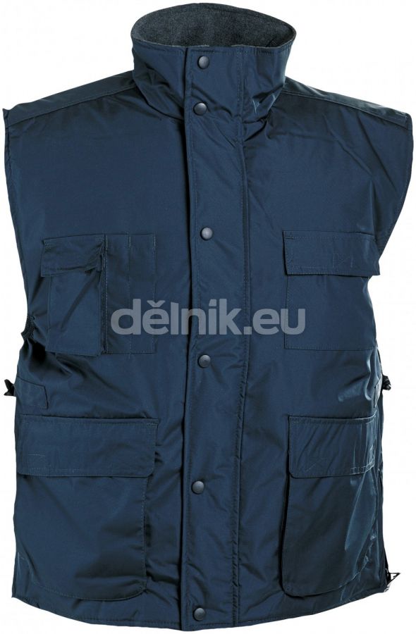 BEAVER pracovní vesta tm. Modrá - Nepromokavá vesta zateplená polyesterovou střiží, 100% polyester povrstvený PVC, polyesterová podšívka se zipem přizpůsobená pro strojní vyšívání, velikosti S - XXXL