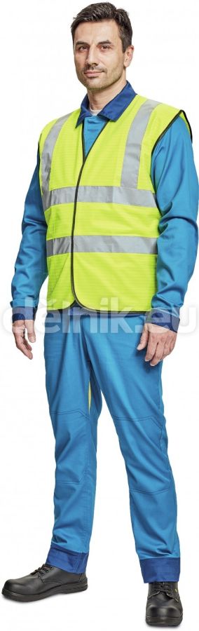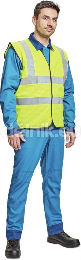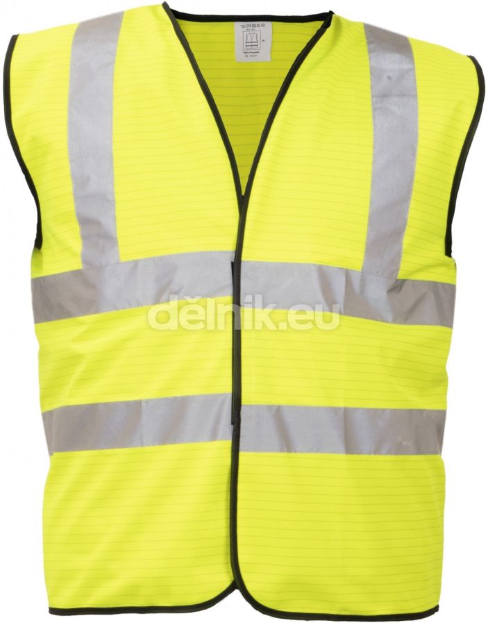 vesta s vysokou viditelností; reflektivní pruhy; zapínání na suchý zip; vhodné pro použítí v ESD chráněném prostoru; materiál: 98 % polyester, 2 % antistatické vlákno, 120 g/m²