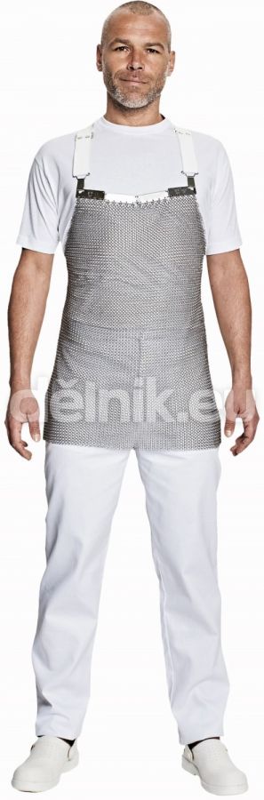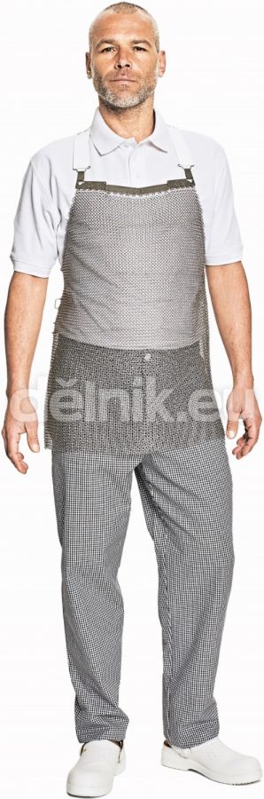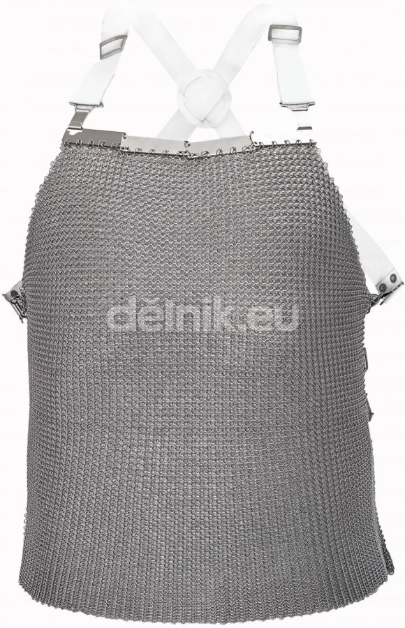 ochranná řeznická zástěra proti říznutí a budnutí ručními noži; vyrobena z nerezových ocelových kroužků; nastavitelná výška pomocí šlí s kovovými přezkami, délka 60 cm nebo 75 cm; svrchní materiál: 100 % ocel