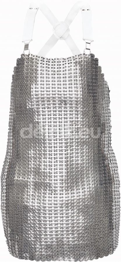 ochranná řeznická zástěra proti prořezu; vyrobena ze zaoblených hliníkových destiček spojených nerezovými ocelovými kroužky z nerez oceli INOX; ochrana proti říznutí a bodnutí nožem; nastavitelná výška pomocí šlí s kovovými přezkami, délka 60 cm nebo 75 cm; svrchní materiál: 100 % ocel; svrchní zesílená vrstva: 100 % hliník