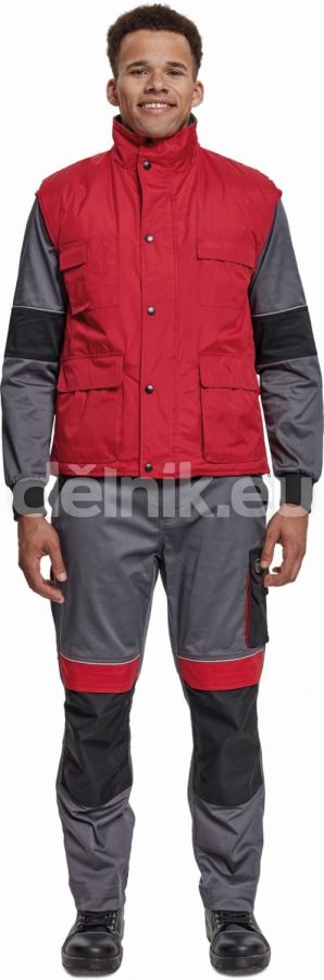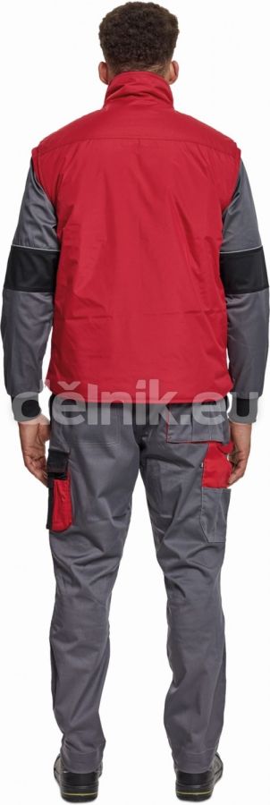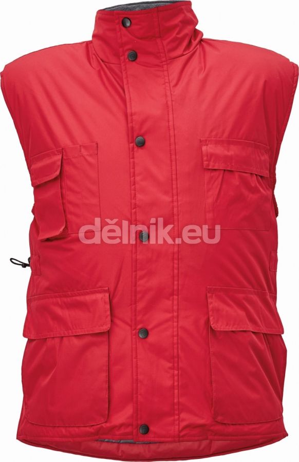 zateplená nepromokavá pánská zimní vesta; prodloužený díl na zádech; polyesterový materiál s mechanicky odolnou úpravou RipStop; 2 přední kapsy, 2 náprsní kapsy; spodní lem ke stažení na šňůrku; na bocích je polohování na zip pro regulaci obvodu vesty; svrchní materiál: 100 % polyester, 230 g/m², povrstvení: PVC; vnitřní podšívka: 100 % polyester