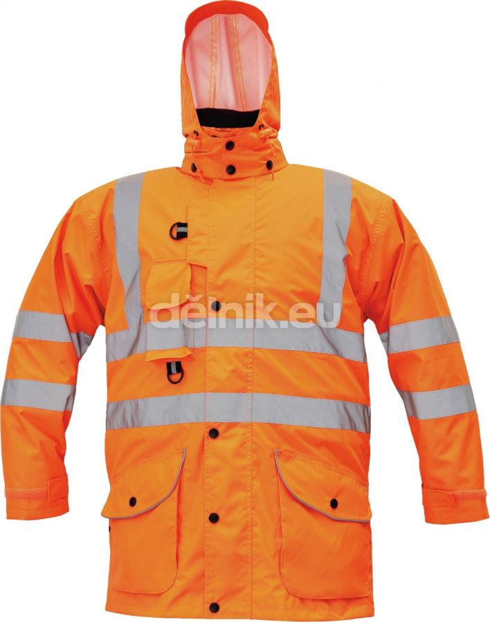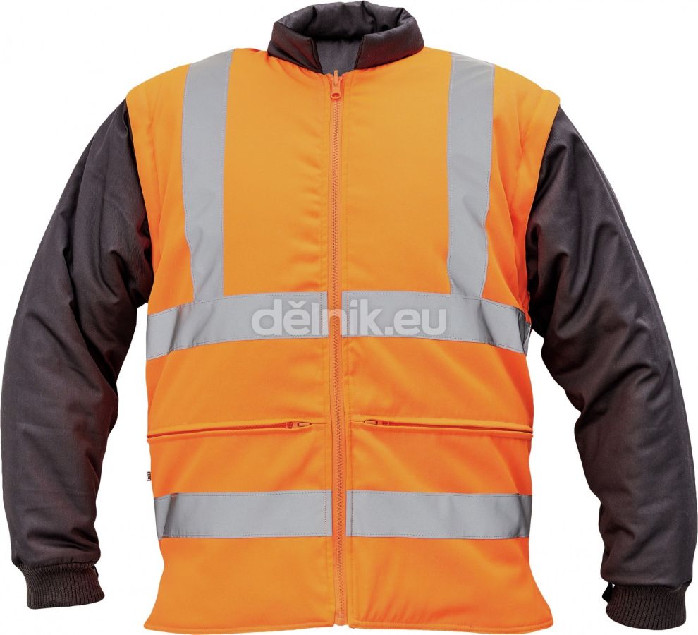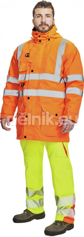 pánská HI-VIS zimní bunda 7 v 1; odepínací svrchní větruodolná a voděodolná bunda s lepenými švy a odepínací kapucí; reflexní pruhy přes ramena, hruď a rukávy; 2 velké přední kapsy, 1 náprsní kapsa; oboustranná samostatná vnitřní bunda s odepínacími rukávy a mnoha multifunkčními kapsami, lze použít jako samostatnou HI-VIS vestu; reflexní pruhy přes ramena, okolo hrudi a boků; svrchní materiál: 100 % polyester