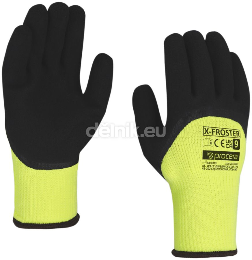 Rukavice X-FROSTER ze zatepleného zářivě žlutého úpletu, potažené černou latexovou pěnou v úchopové části a celými prsty v zadní části. Ideální pro ruční práci při nízkých teplotách. Velmi dobrá přilnavost. Vysoká odolnost proti oděru. Zakončeno stahovací šňůrkou. CE EN 420. Balení: karton 12/120. Barva: žlutá/černá