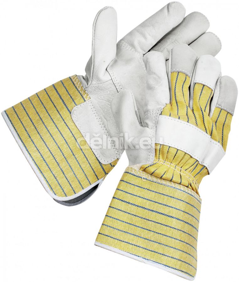 Rukavice z lícové hověziny v dlani s podšívkou a z bavlněné tkaniny na hřbetu a manžetě o délce 10 cm.