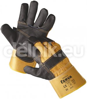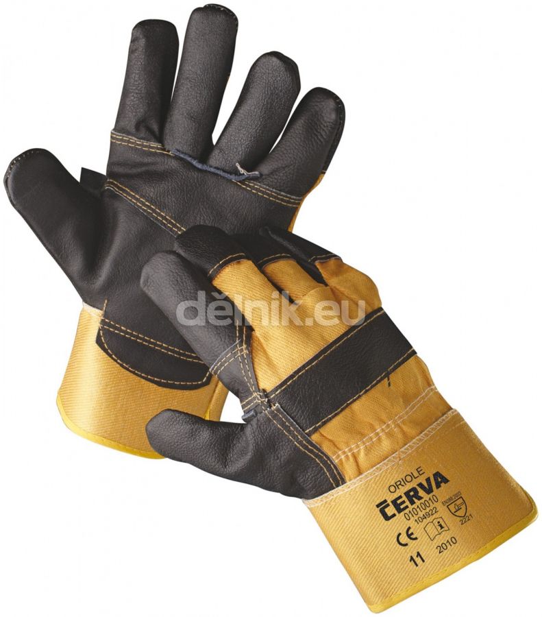 ORIOLE pracovní rukavice kombinované - dlaň z tmavé jednobarevné lícové nábytkové hověziny, hřbet a tuhá manžeta ze žluté bavlněné tkaniny, podšívka ve dlani, velikost 10,5