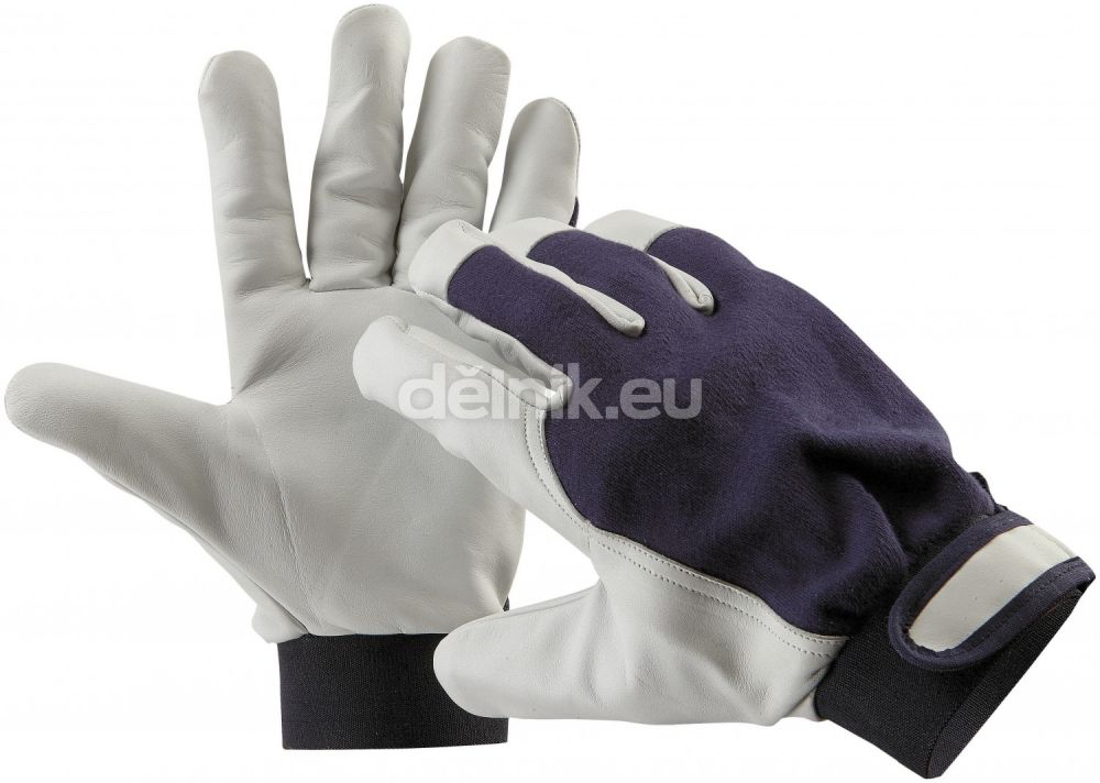 Rukavice šité z jemné lícové kozinky v dlani, modré bavlněné tkaniny na hřbetu a s manžetou na suchý zip.